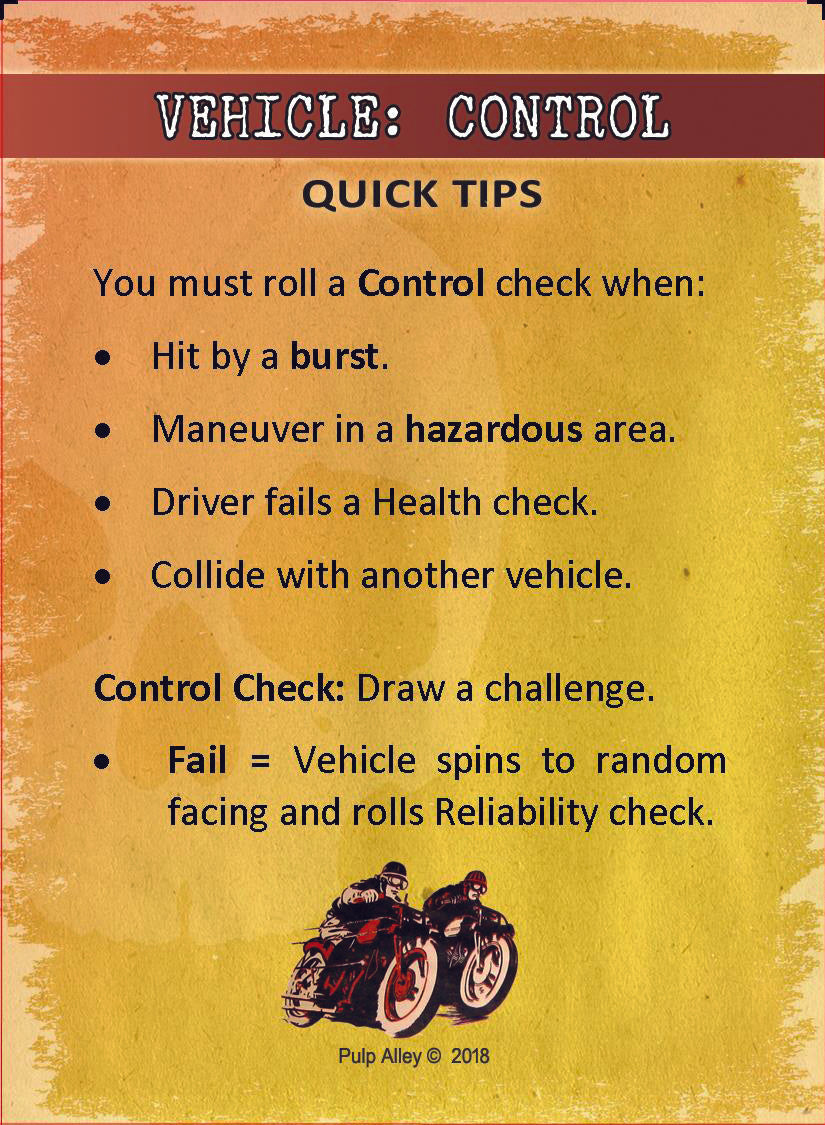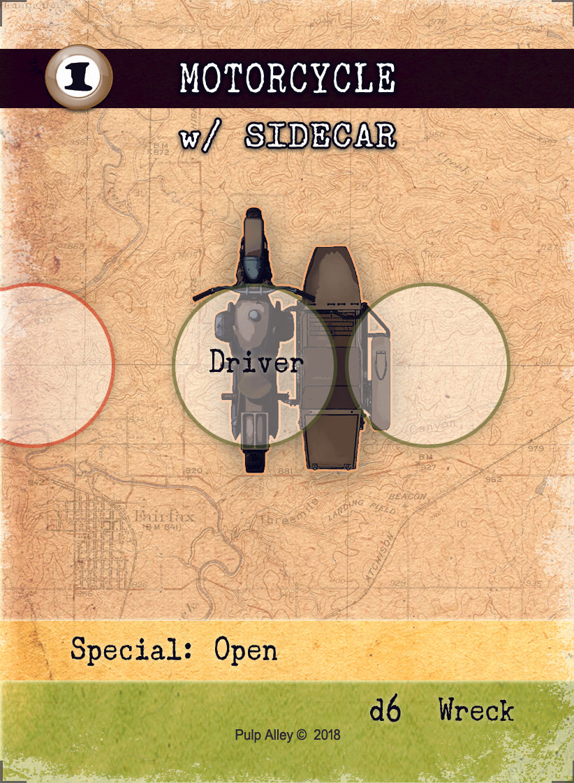This expansion pack includes the basic vehicles we most frequently use in our Pulp Alley scenarios, include Cars, Motorcycles, Pickups, and so on. Pack includes 12 double-sided vehicle cards plus 3 double-sided quick-reference cards. Includes PDF.
